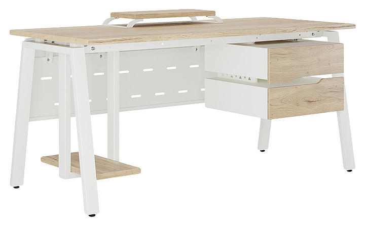 Компьютерный стол Кобор KA-80/70 white/natural используется в офисных помещениях и кабинетах руководителей. Модель оснащена A-образными опорами. Каркас выполнен из металла, выкрашенного в цвет белый муар (RAL9016), столешница – из ламинированной древесно-стружечной плиты (ЛДСП) цвета натуральный дуб (H1180 ST37). Опции (заказываются отдельно):