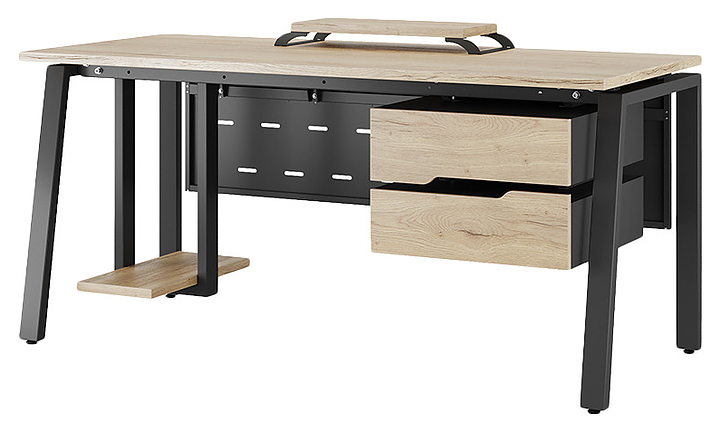 Компьютерный стол Кобор KAB-140/60 black/natural используется в офисных помещениях и кабинетах руководителей. Модель оснащена A-образными опорами со скошенными фронтальными сегментами. Каркас выполнен из металла, выкрашенного в цвет черный муар (RAL9005), столешница – из ламинированной древесно-стружечной плиты (ЛДСП) цвета натуральный дуб (H1180 ST37). Опции (заказываются отдельно):