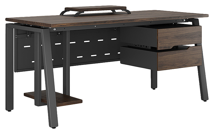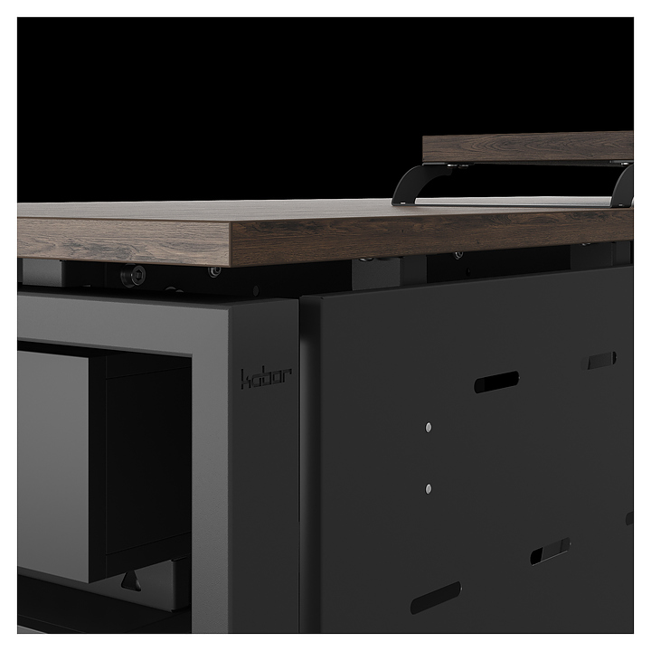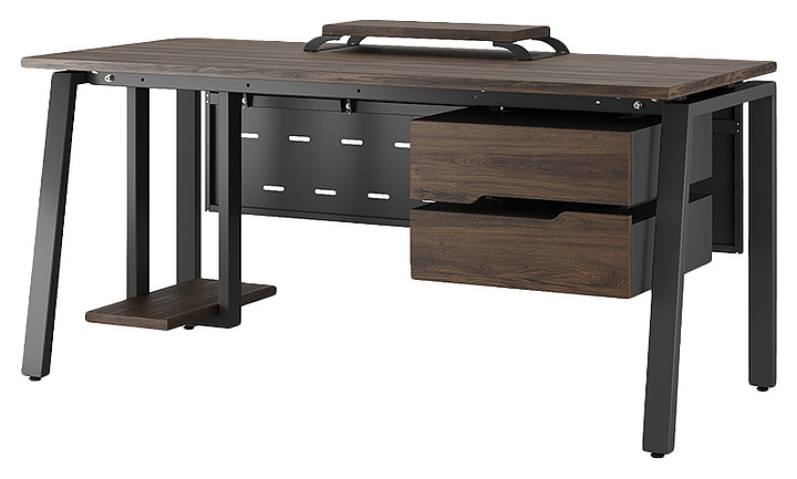 Компьютерный стол Кобор KAB-120/60 black/charlston используется в офисных помещениях и кабинетах руководителей. Модель оснащена A-образными опорами со скошенными фронтальными сегментами. Каркас выполнен из металла, выкрашенного в цвет черный муар (RAL9005), столешница – из ламинированной древесно-стружечной плиты (ЛДСП) цвета дуб чарльстон (H3154 ST36). Опции (заказываются отдельно):