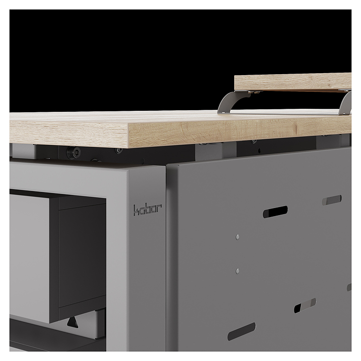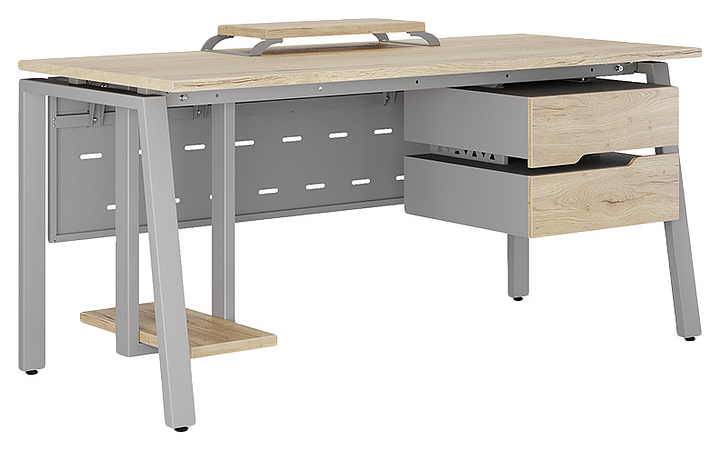 Компьютерный стол Кобор KAB-180/70 aluminum/natural используется в офисных помещениях и кабинетах руководителей. Модель оснащена A-образными опорами со скошенными фронтальными сегментами. Каркас выполнен из металла, выкрашенного в цвет алюминиевый металлик (RAL9006), столешница – из ламинированной древесно-стружечной плиты (ЛДСП) цвета натуральный дуб (H1180 ST37). Опции (заказываются отдельно):