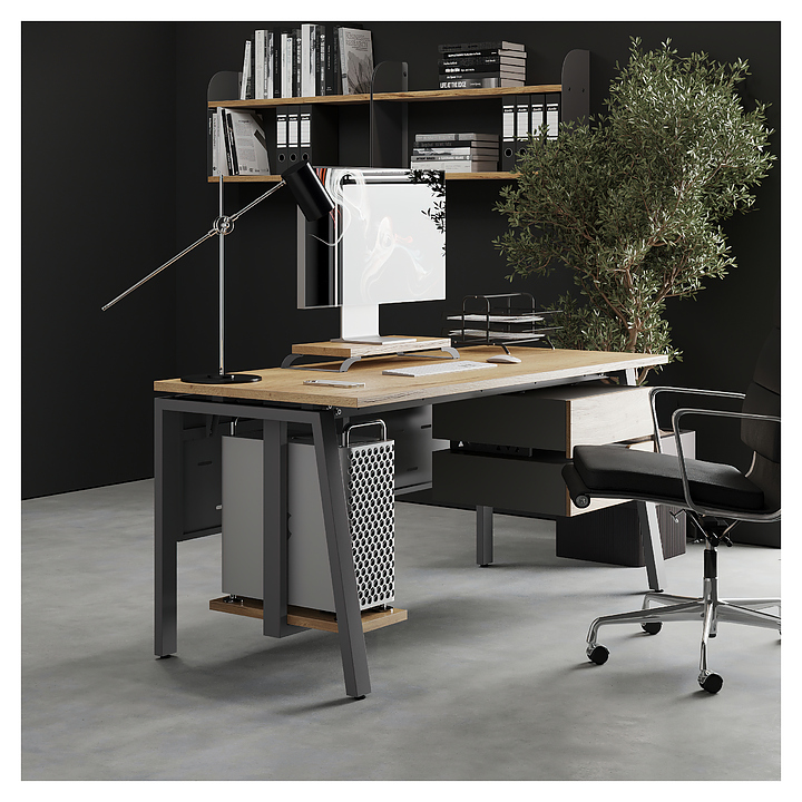 Компьютерный стол Кобор KAB-120/80 aluminum/natural используется в офисных помещениях и кабинетах руководителей. Модель оснащена A-образными опорами со скошенными фронтальными сегментами. Каркас выполнен из металла, выкрашенного в цвет алюминиевый металлик (RAL9006), столешница – из ламинированной древесно-стружечной плиты (ЛДСП) цвета натуральный дуб (H1180 ST37). Опции (заказываются отдельно):