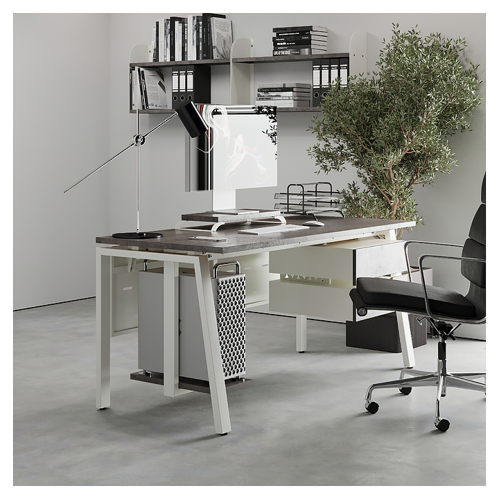 Компьютерный стол Кобор КAB-120/80 white/chicago используется в офисных помещениях и кабинетах руководителей. Модель оснащена A-образными опорами со скошенными фронтальными сегментами. Каркас выполнен из металла, выкрашенного в цвет белый муар (RAL9016), столешница – из ламинированной древесно-стружечной плиты (ЛДСП) цвета бетон чикаго (F186 ST9). Опции (заказываются отдельно):