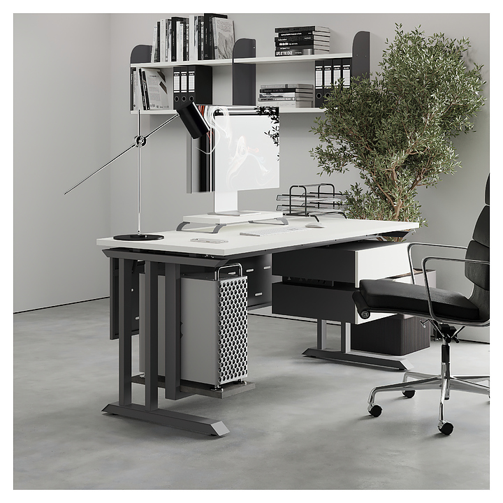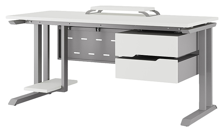 Компьютерный стол Кобор KL1-140/70 aluminum/premium используется в офисных помещениях и кабинетах руководителей. Модель оснащена L-образными опорами. Каркас выполнен из металла, выкрашенного в цвет алюминиевый металлик (RAL9006), столешница – из ламинированной древесно-стружечной плиты (ЛДСП) цвета белый премиум (W1000 ST9). Опции (заказываются отдельно):
