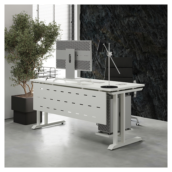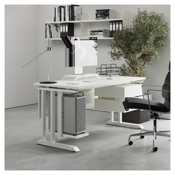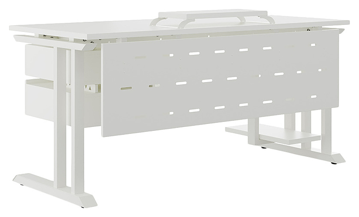 Компьютерный стол Кобор KL1-180/80 white/premium используется в офисных помещениях и кабинетах руководителей. Модель оснащена L-образными опорами. Каркас выполнен из металла, выкрашенного в цвет белый муар (RAL9016), столешница – из ламинированной древесно-стружечной плиты (ЛДСП) цвета белый премиум (W1000 ST9). Опции (заказываются отдельно):