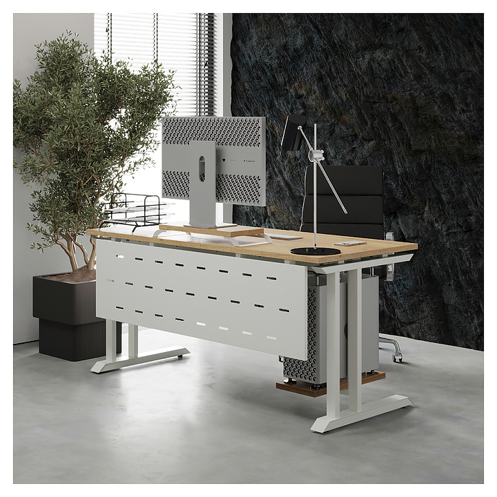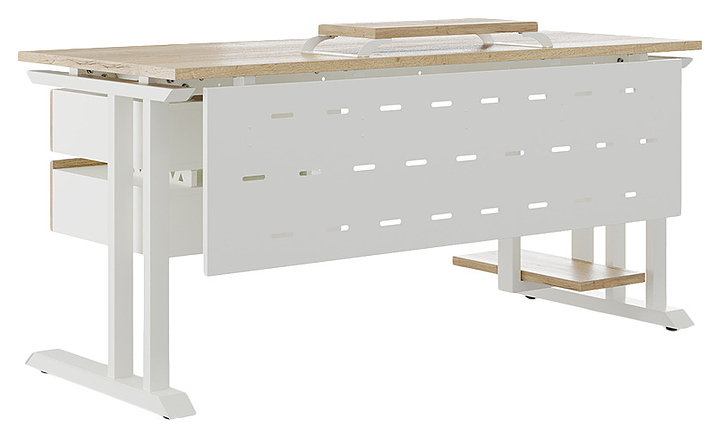 Компьютерный стол Кобор КL1-180/70 white/natural используется в офисных помещениях и кабинетах руководителей. Модель оснащена L-образными опорами. Каркас выполнен из металла, выкрашенного в цвет белый муар (RAL9016), столешница – из ламинированной древесно-стружечной плиты (ЛДСП) цвета натуральный дуб (H1180 ST37). Опции (заказываются отдельно):