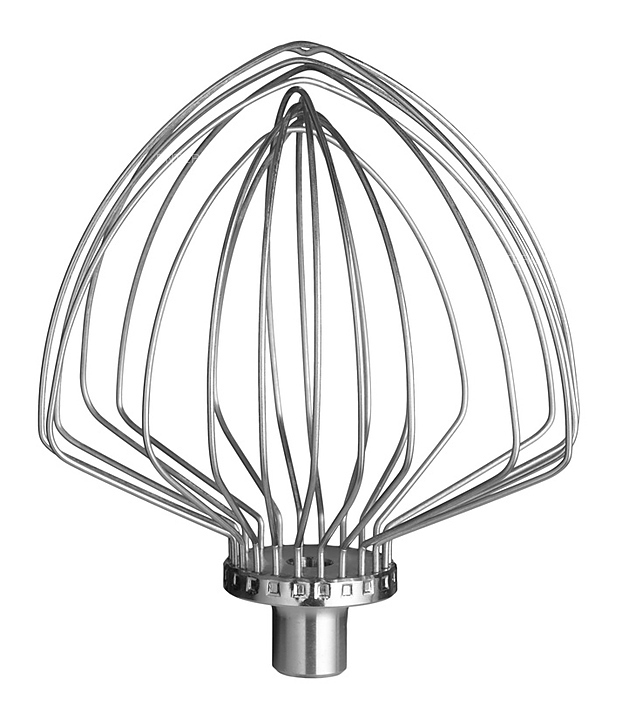 Стандартная комплектация миксера включает венчик для взбивания, лопатку для смешивания, крюк для теста и защитный обод.