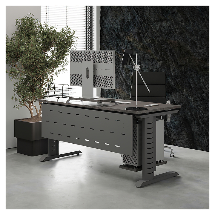 Компьютерный стол Кобор КL2-180/60 aluminum/chicago используется в офисных помещениях и кабинетах руководителей. Модель оснащена L-образными опорами с декоративными вставками на боковинах. Каркас выполнен из металла, выкрашенного в цвет алюминиевый металлик (RAL9006), столешница – из ламинированной древесно-стружечной плиты (ЛДСП) цвета бетон чикаго (F186 ST9). Опции (заказываются отдельно):
