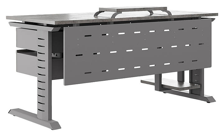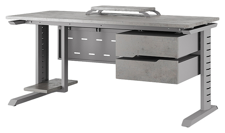 Компьютерный стол Кобор КL2-160/70 aluminum/chicago используется в офисных помещениях и кабинетах руководителей. Модель оснащена L-образными опорами с декоративными вставками на боковинах. Каркас выполнен из металла, выкрашенного в цвет алюминиевый металлик (RAL9006), столешница – из ламинированной древесно-стружечной плиты (ЛДСП) цвета бетон чикаго (F186 ST9). Опции (заказываются отдельно):