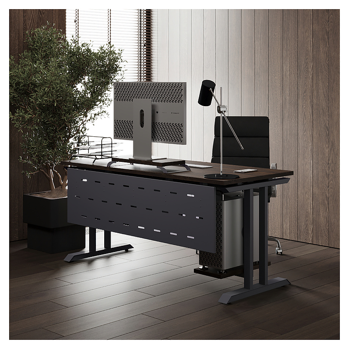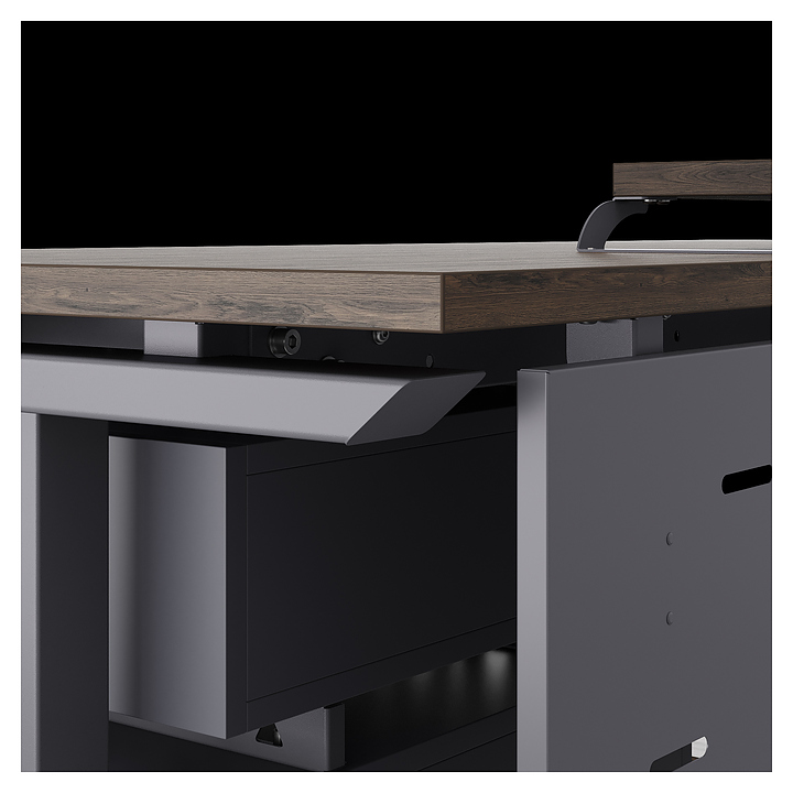 Компьютерный стол Кобор КT-100/70 graphite/charlston используется в офисных помещениях и кабинетах руководителей. Модель оснащена T-образными опорами. Каркас выполнен из металла, выкрашенного в цвет графит муар (RAL7024), столешница – из ламинированной древесно-стружечной плиты (ЛДСП) цвета дуб чарльстон (H3154 ST36). Опции (заказываются отдельно):