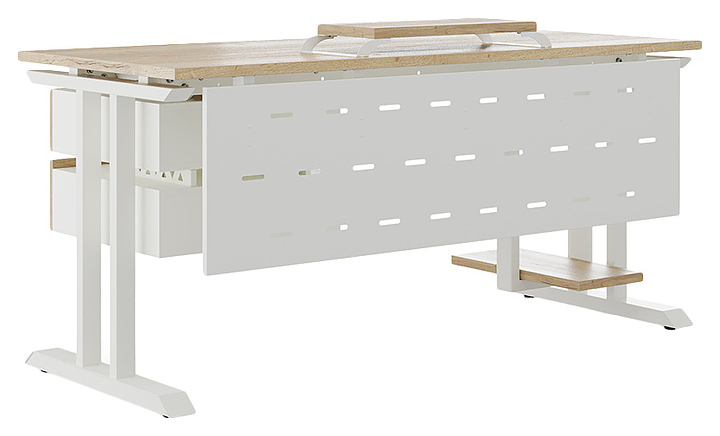 Компьютерный стол Кобор КT-100/70 white/natural используется в офисных помещениях и кабинетах руководителей. Модель оснащена T-образными опорами. Каркас выполнен из металла, выкрашенного в цвет белый муар (RAL9016), столешница – из ламинированной древесно-стружечной плиты (ЛДСП) цвета натуральный дуб (H1180 ST37). Опции (заказываются отдельно):