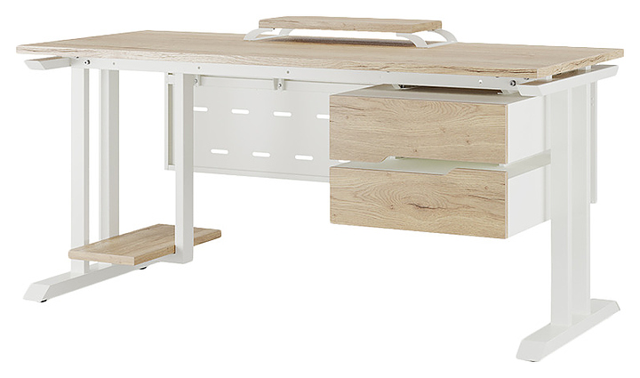 Компьютерный стол Кобор KT-180/70 white/natural используется в офисных помещениях и кабинетах руководителей. Модель оснащена T-образными опорами. Каркас выполнен из металла, выкрашенного в цвет белый муар (RAL9016), столешница – из ламинированной древесно-стружечной плиты (ЛДСП) цвета натуральный дуб (H1180 ST37). Опции (заказываются отдельно):