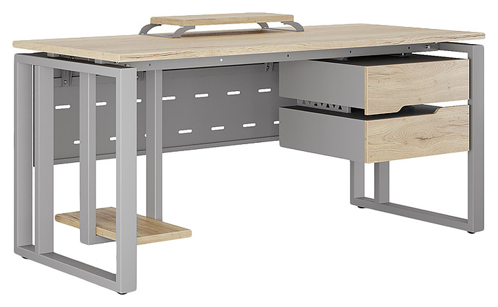 Компьютерный стол Кобор KO2-120/80 aluminum/natural используется в офисных помещениях и кабинетах руководителей. Модель оснащена усиленными вертикальной балкой O-образными опорами. Каркас выполнен из металла, выкрашенного в цвет алюминиевый металлик (RAL9006), столешница – из ламинированной древесно-стружечной плиты (ЛДСП) цвета натуральный дуб (H1180 ST37). Опции (заказываются отдельно):