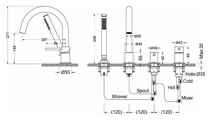 Смеситель для ванны и душа Aquatek Европа AQ1348CR встраиваемый на борт ванны, 4 отверстия, хром