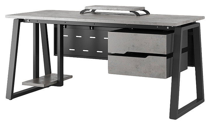 Компьютерный стол Кобор КTR-160/60 black/chicago используется в офисных помещениях и кабинетах руководителей. Модель оснащена опорами в форме трапеции. Каркас выполнен из металла, выкрашенного в цвет черный муар (RAL9005), столешница – из ламинированной древесно-стружечной плиты (ЛДСП) цвета бетон чикаго (F186 ST9). Опции (заказываются отдельно):