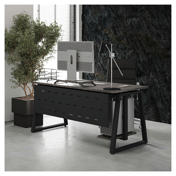 Компьютерный стол Кобор КTR-100/70 black/chicago используется в офисных помещениях и кабинетах руководителей. Модель оснащена опорами в форме трапеции. Каркас выполнен из металла, выкрашенного в цвет черный муар (RAL9005), столешница – из ламинированной древесно-стружечной плиты (ЛДСП) цвета бетон чикаго (F186 ST9). Опции (заказываются отдельно):