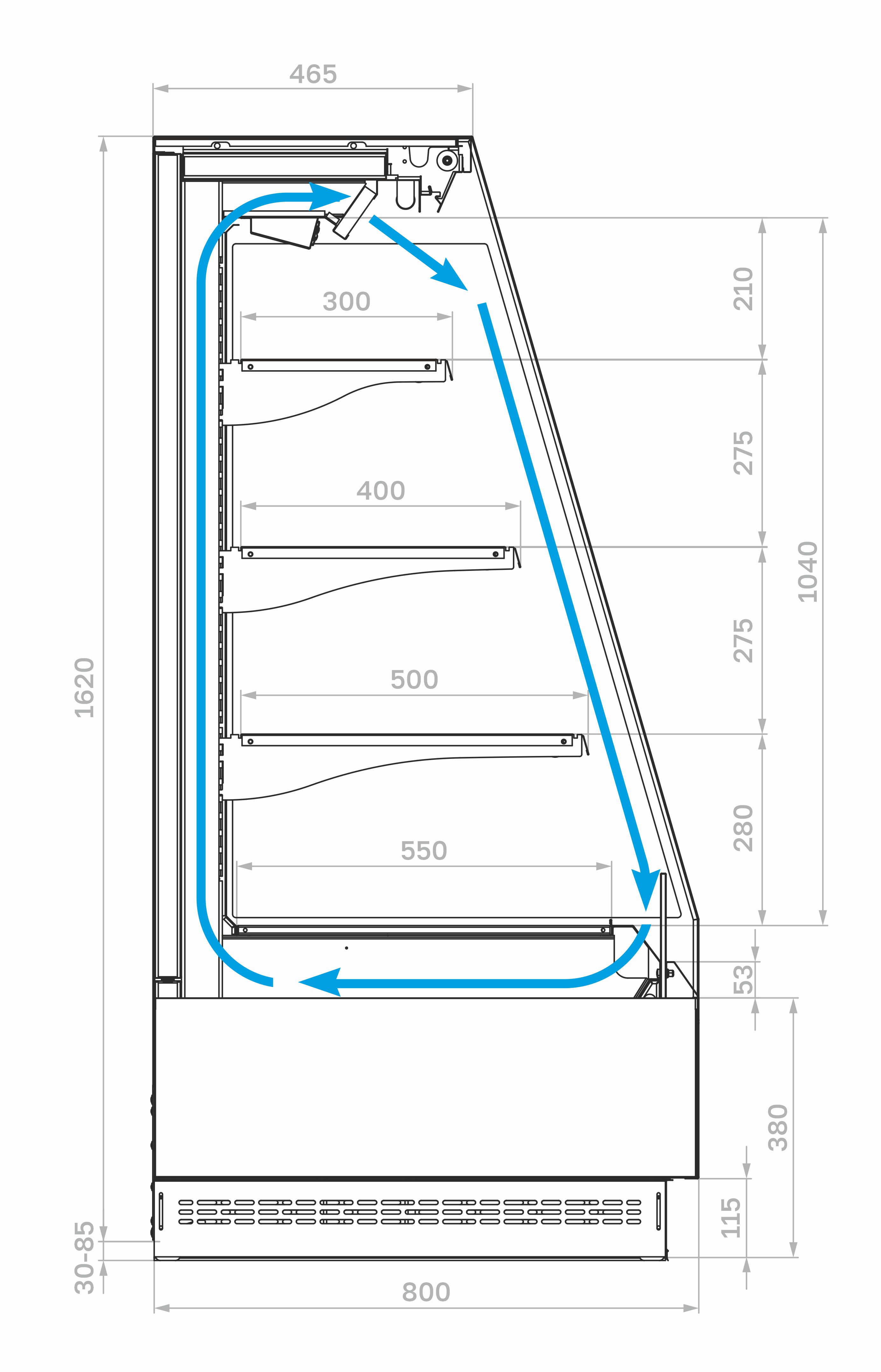 Холодильная горка Carboma F 16-08 VM 1,3-2 версия 2.0 серии Tokyo 2 используется на предприятиях общественного питания и торговли для охлаждения, кратковременного хранения и предпродажной демонстрации напитков, мяса, птицы, полуфабрикатов, молочных и гастрономических изделий. Модель оснащена 3 рядами навесных полок с кронштейнами, глухими боковинами, подставкой с фронтальной термовыводящей и цокольной решетками. Корпус с наклонным фронтом выполнен из стали с антикоррозийным покрытием внешних панелей, полок и кронштейнов серого цвета (RAL 9006), цоколя и интерьера черного цвета (RAL 9005), теплоизоляция – из пенополиуретана. Особенности: