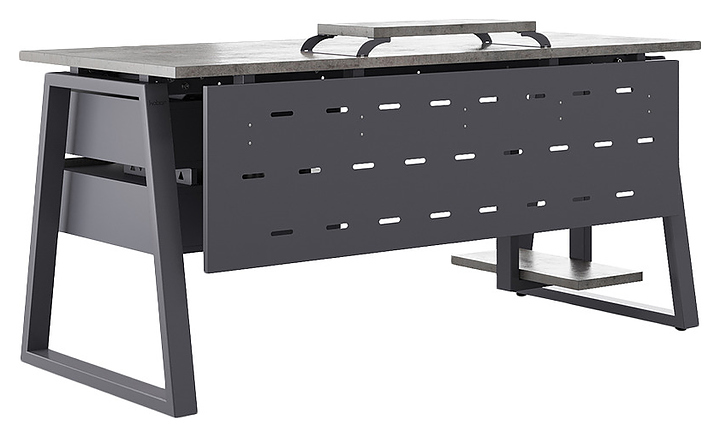 Компьютерный стол Кобор КTR-140/80 graphite/chicagoиспользуется в офисных помещениях и кабинетах руководителей. Модель оснащена опорами в форме трапеции. Каркас выполнен из металла, выкрашенного в цвет графит муар (RAL7024), столешница – из ламинированной древесно-стружечной плиты (ЛДСП) цвета бетон чикаго (F186 ST9). Опции (заказываются отдельно):