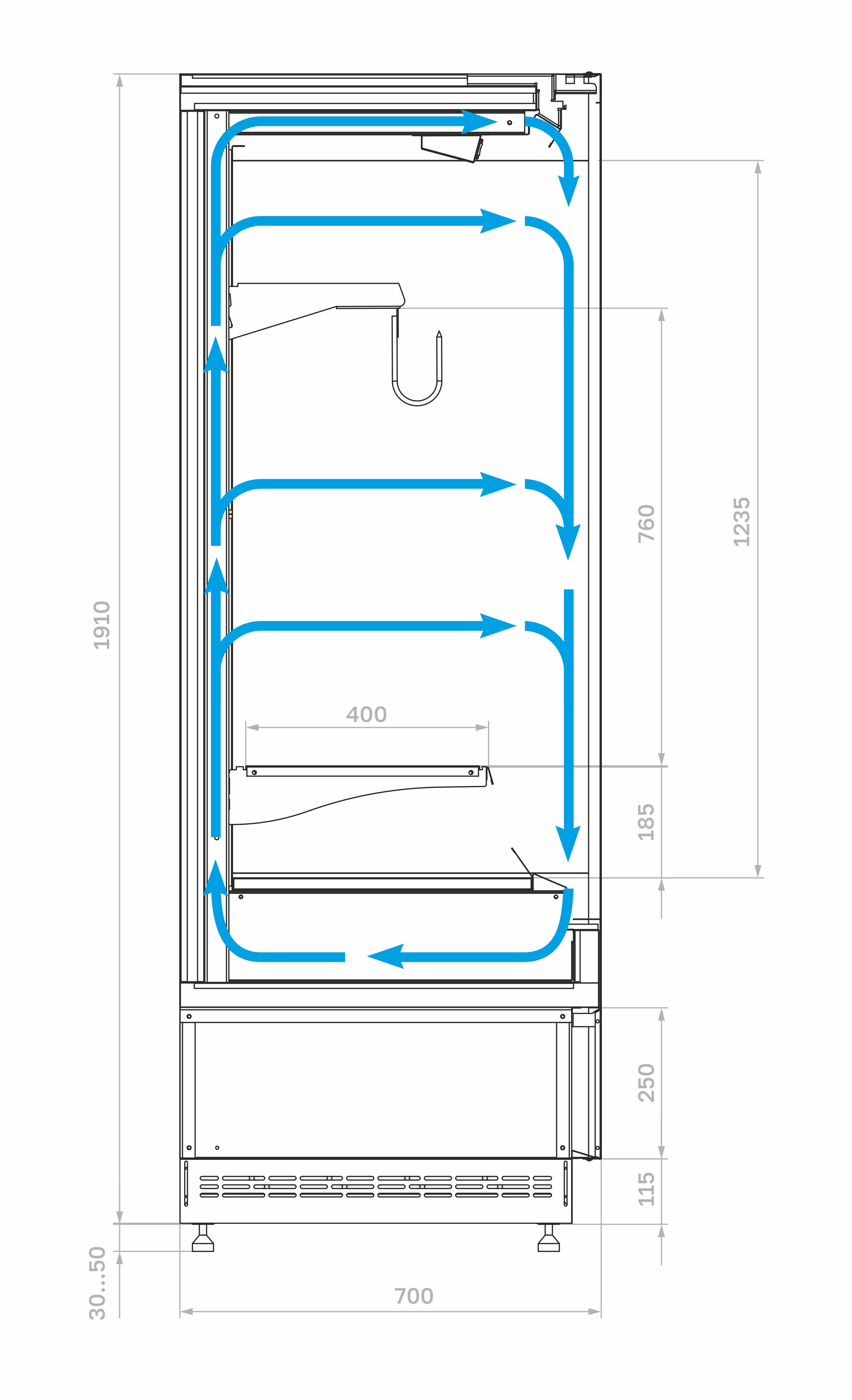 Среднетемпературная холодильная горка Carboma FC 20-07 VV 0,7-1 версия 2.0 Standard серии Сube Flesh 2 используется на предприятиях общественного питания и торговли для кратковременного хранения и предпродажной демонстрации мясной продукции. Модель оснащена навесной перфорированной полкой с кронштейнами, подвесом с крюками для мяса, распашной дверью с рукояткой по всей длине створки, подставкой с фронтальной термовыводящей и цокольной решетками. Корпус прямоугольно ориентированной формы выполнен из стали с антикоррозийным покрытием внешних панелей и интерьера цвета нержавеющая сталь (RAL 0430), теплоизоляция – из пенополиуретана. Особенности: