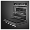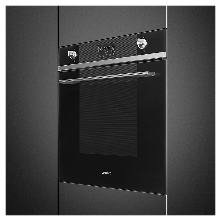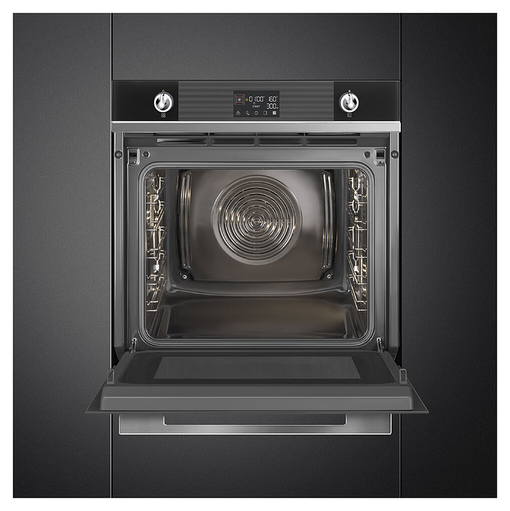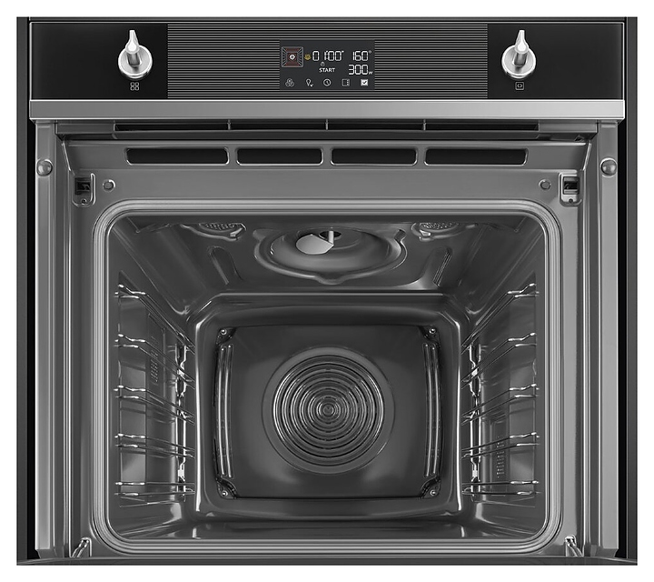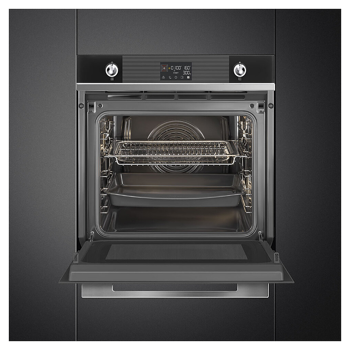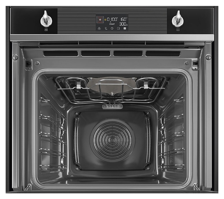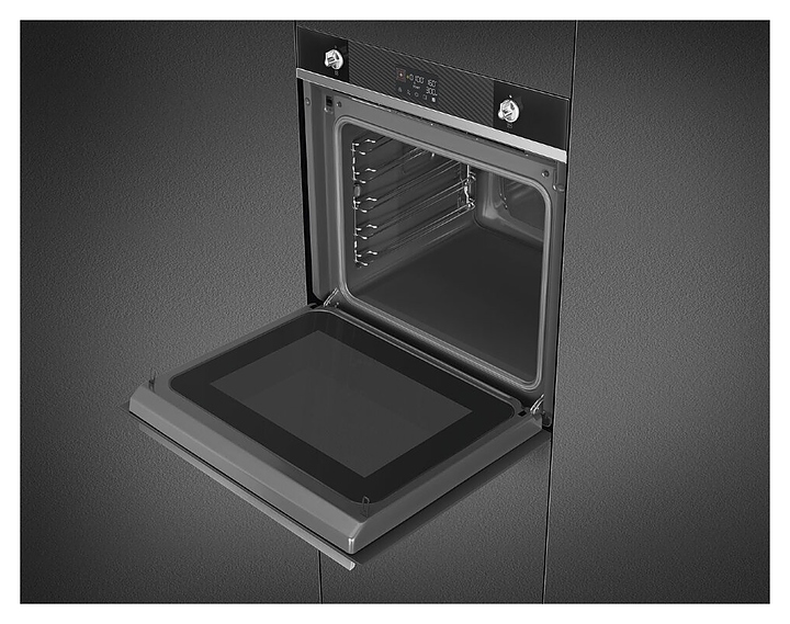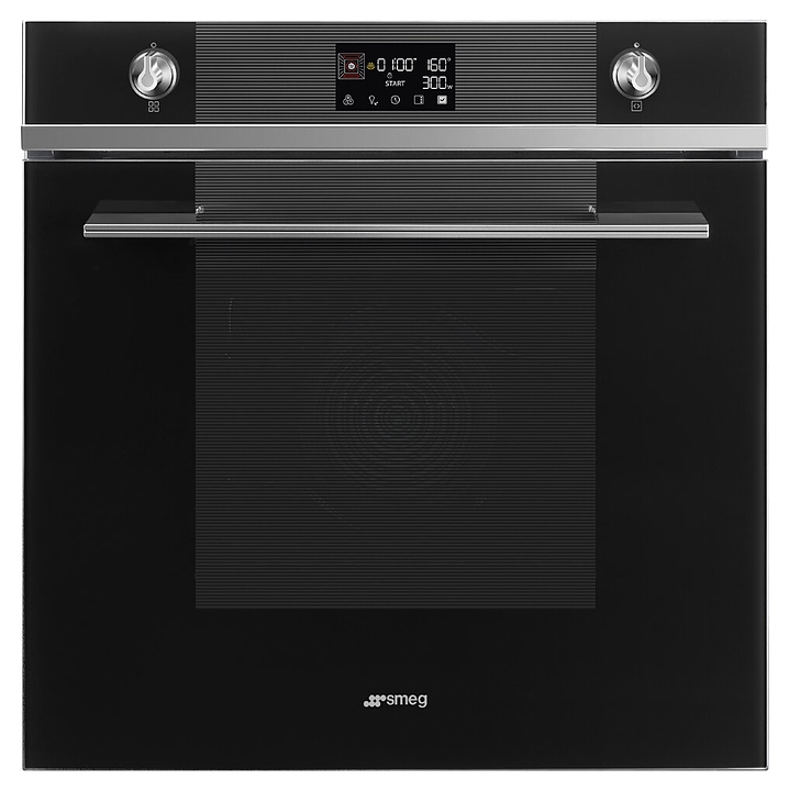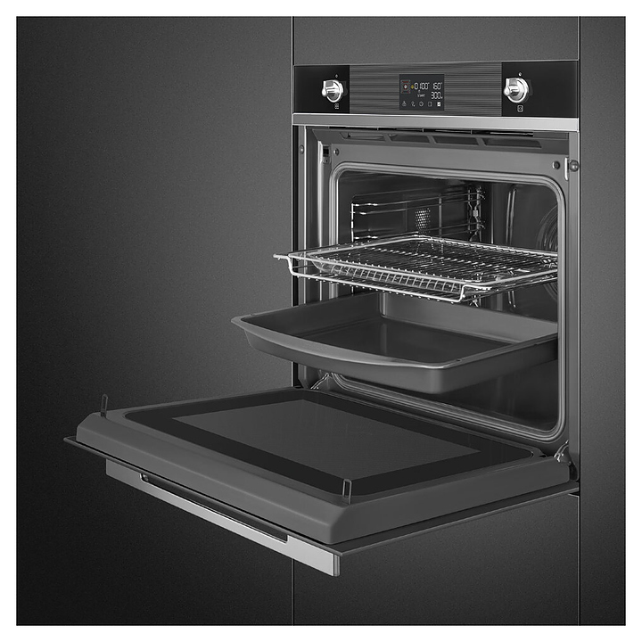 Электрический духовой шкаф SMEG SO6102M2N предназначен для приготовления большого ассортимента блюд в домашних условиях. Модель оснащена рабочей камерой GALILEO с верхним и нижним нагревательными элементамии, грилем, расположенными в задней стенке кольцевым нагревателем и вентилятором, магнетроном, 2 съемными стойками с 5 уровнями направляющих для противней, откидной дверью со смотровым окном и длинной уплощенной горизонтальной рукояткой, панелью управления с 2 поворотными переключателями и сенсорным жидкокристаллическим дисплеем (EVO Screen). Корпус выполнен из высококачественной стали, фронт черного цвета с полным глянцевым прозрачным остеклением без винтового крепежа и горизонтальной рамкой на верхней панели, фурнитура – из металла с сатинированной серебристой поверхностью, направляющие с хромированным покрытием, стандартный противень – из термостойкого боросиликатного стекла пирекса, глубокий противень – из эмалированного металла.