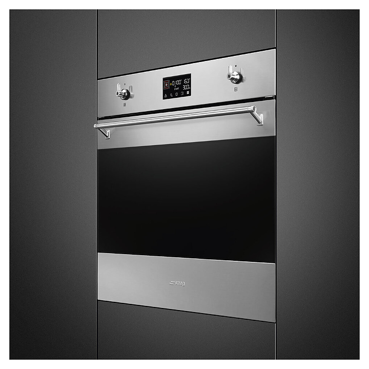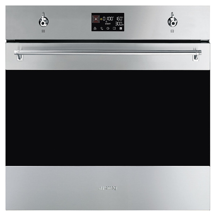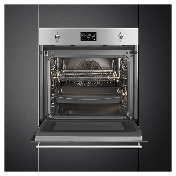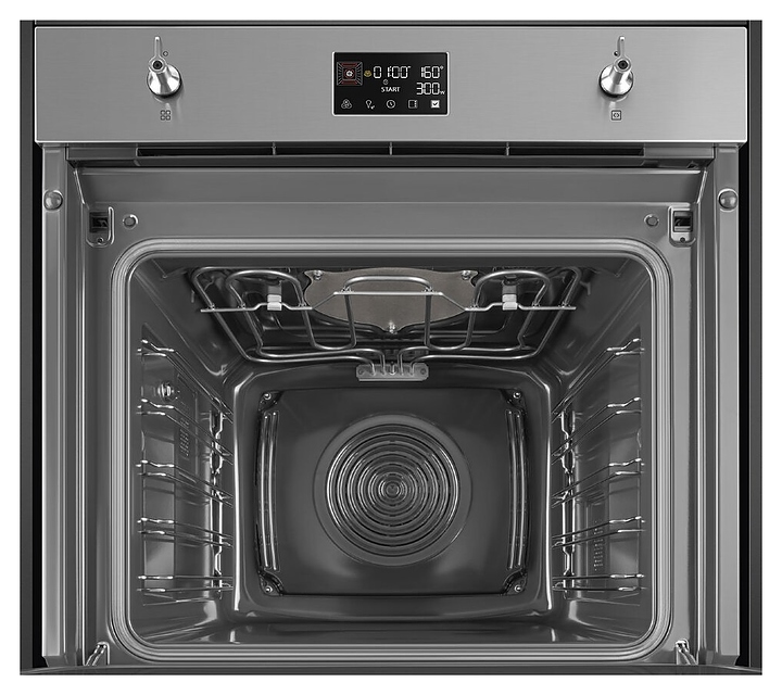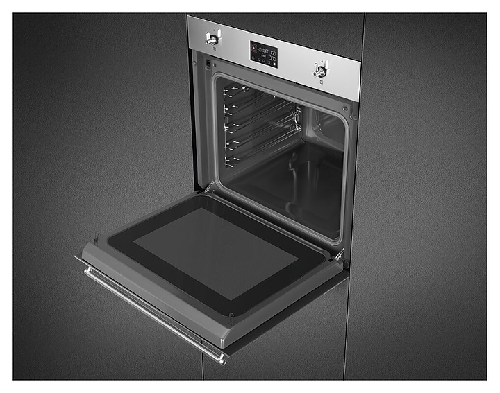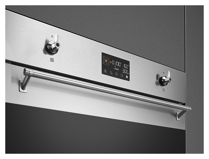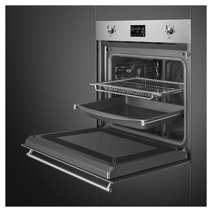 Электрический духовой шкаф SMEG SO6302M2X предназначен для приготовления большого ассортимента блюд в домашних условиях. Модель оснащена просторной рабочей камерой Galileo с верхним и нижним нагревательными элементамии, грилем, расположенными в задней стенке кольцевым нагревателем и вентилятором, магнетроном, 2 съемными стойками с 5 уровнями направляющих для противней, откидной дверью со смотровым окном и длинной трубчатой горизонтальной рукояткой, панелью управления с 2 поворотными переключателями и сенсорным жидкокристаллическим дисплеем (EVO Screen). Корпус выполнен из высококачественной стали, фронт – из нержавеющей стали с сатинированной поверхностью, частичным внешним остеклением двери без винтового крепежа стеклом Eclipse с черной тонировкой, фурнитура – из металла с серебристым покрытием, стойки с направляющими и решетки – из нержавеющей стали, стандартный противень – из термостойкого боросиликатного стекла пирекс, глубокий противень – из эмалированного металла.