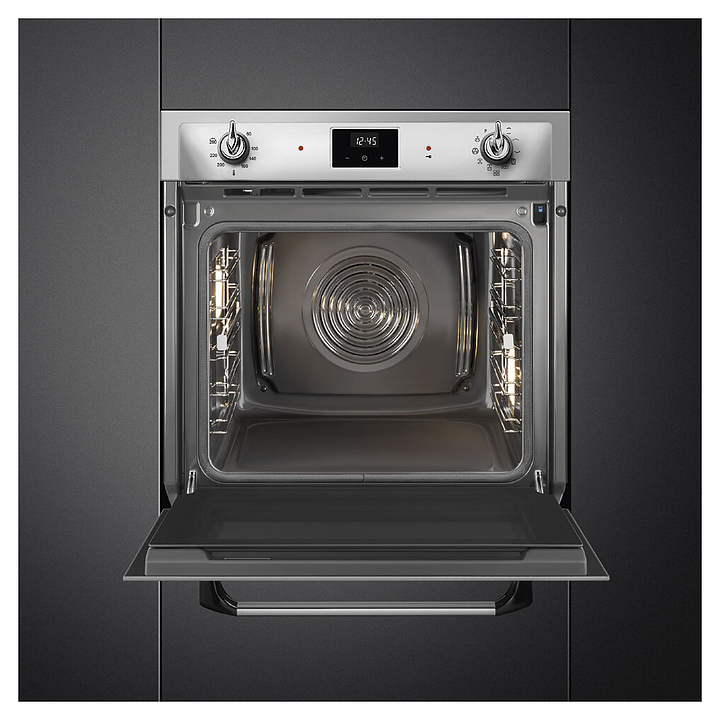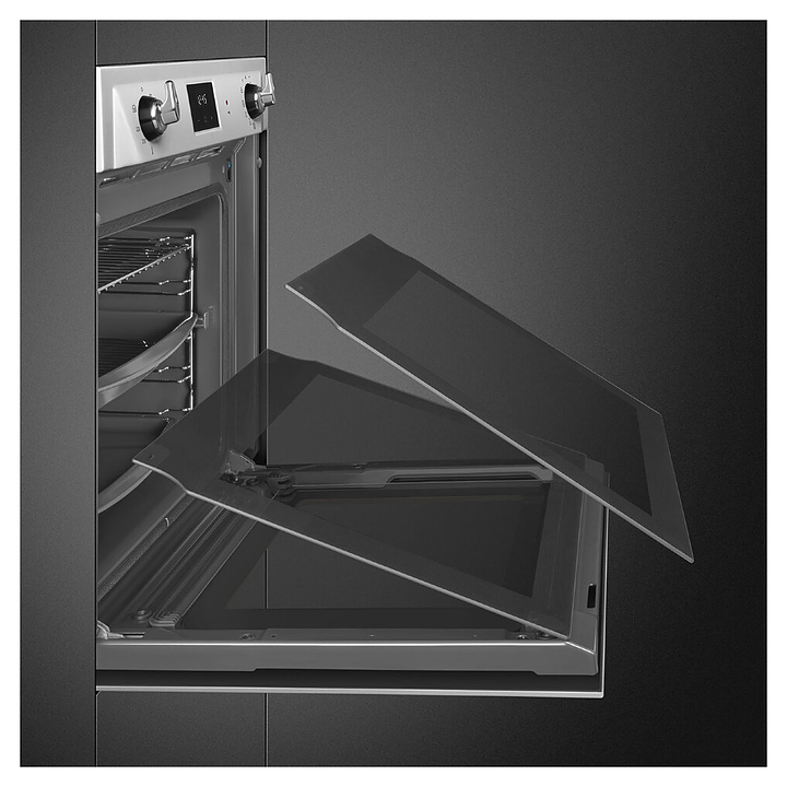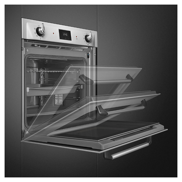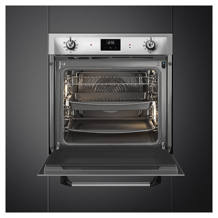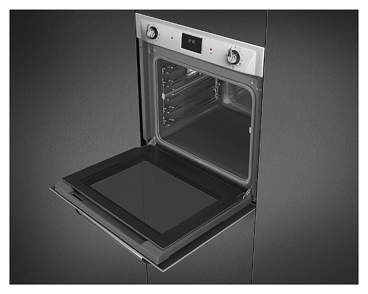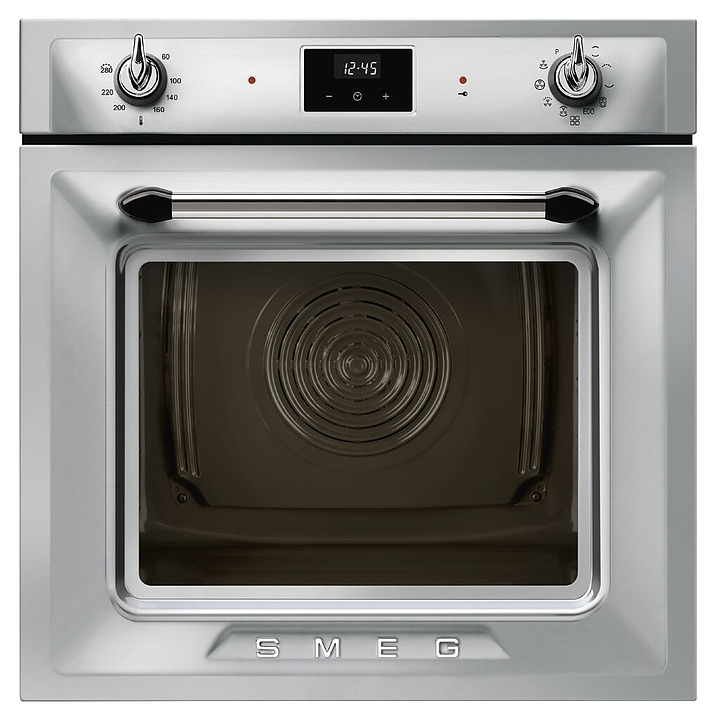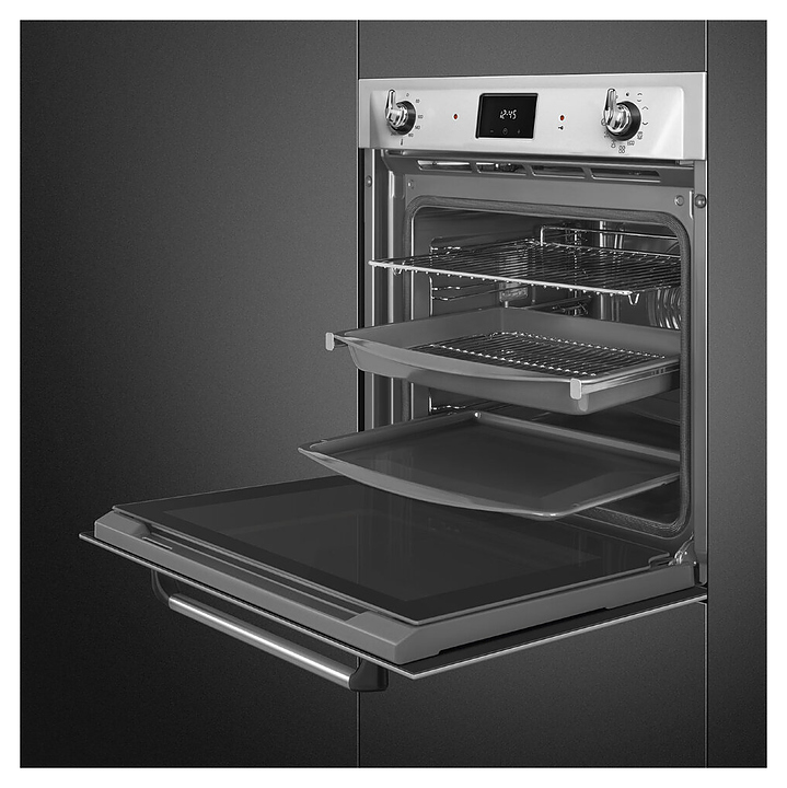 Электрический духовой шкаф SMEG SOP6900TX предназначен для приготовления большого ассортимента блюд в домашних условиях. Модель оснащена рабочей камерой GALILEO с верхним и нижним нагревательными элементамии, грилем, расположенными в задней стенке кольцевым нагревателем и вентилятором, 2 съемными стойками с 5 уровнями направляющих для противней, откидной дверью со смотровым окном и длинной горизонтальной рукояткой, панелью управления с 2 поворотными регуляторами, сенсорной клавиатурой и светодиодным дисплеем (Digiscreen). Корпус выполнен из высококачественной стали, фронт – из нержавеющей стали с фактурными выпуклостями, сатинированной поверхностью и прозрачным остеклением двери, фурнитура – из металла с сатинированной поверхностью, рукоятка с черными ромбовидными наконечниками, направляющие с хромированным покрытием, глубокий противень – из эмалированного металла.