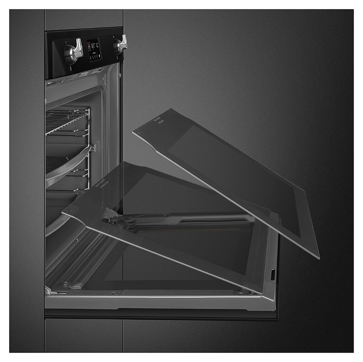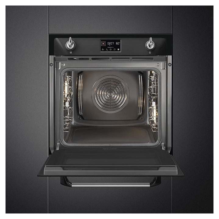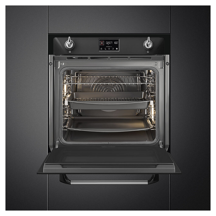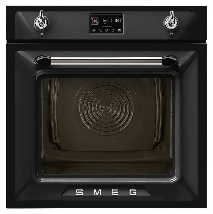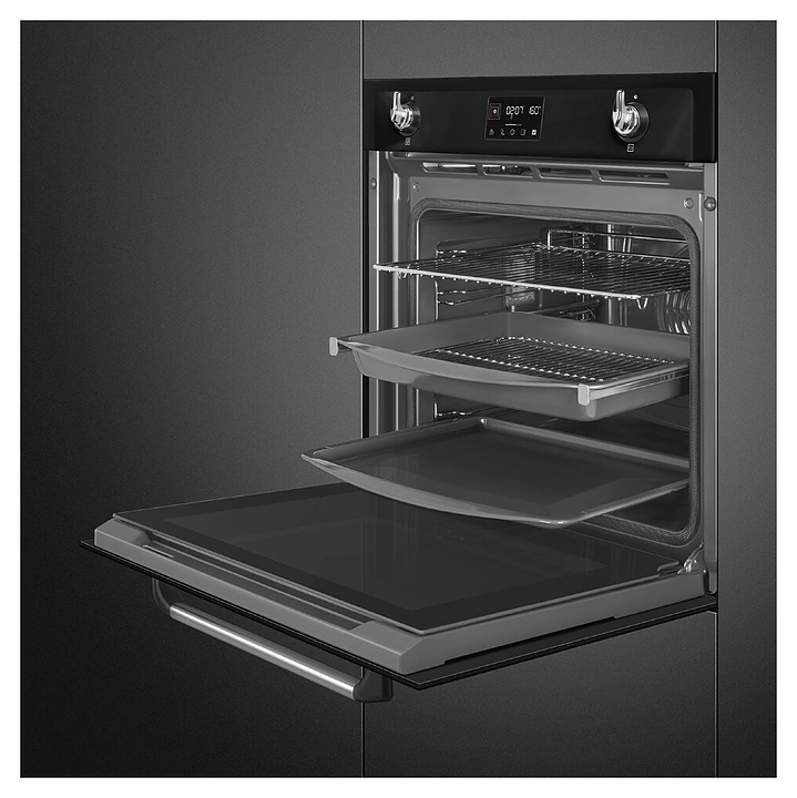 Электрический духовой шкаф SMEG SOP6902S2PN предназначен для приготовления большого ассортимента блюд в домашних условиях. Модель оснащена рабочей камерой GALILEO с верхним и нижним нагревательными элементами, грилем, расположенными в задней стенке кольцевым нагревателем и вентилятором, парогенератором, 2 съемными стойками с 5 уровнями направляющих для противней, откидной дверью с прямоугольным смотровым окном и трубчатой горизонтальной рукояткой, панелью управления с 2 поворотными переключателями и цветным жидкокристаллическим дисплеем (EVO Screen). Корпус выполнен из высококачественной стали, фронт с фактурными выпуклостями на верхней панели и двери – из стали с покрытием черной эмалью и остеклением окна прозрачным стеклом, фурнитура – из металла с сатинированной серебристой поверхностью, держатели рукоятки –из пластика с черной поверхностью, противни – из эмалированной стали, стойки с направляющими и решетки – из нержавеющей стали.