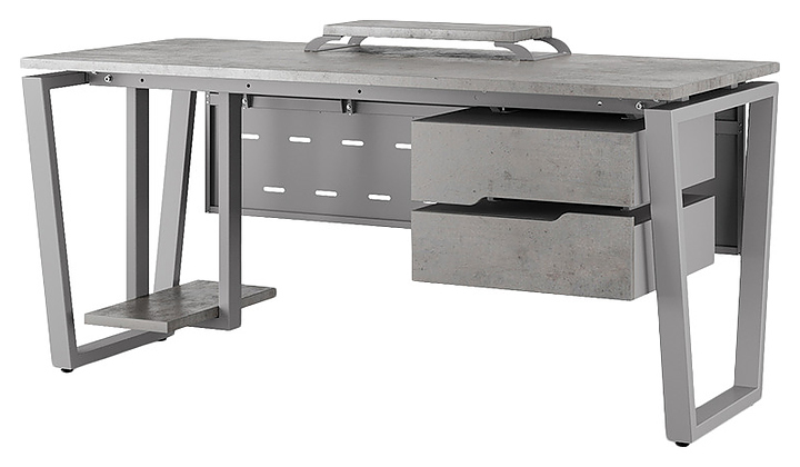 Компьютерный стол Кобор KOTR-180/60 aluminum/chicago используется в офисных помещениях и кабинетах руководителей. Модель оснащена опорами в форме обратной трапеции. Каркас выполнен из металла, выкрашенного в цвет алюминиевый металлик (RAL9006), столешница – из ламинированной древесно-стружечной плиты (ЛДСП) цвета бетон чикаго (F186 ST9). Опции (заказываются отдельно):