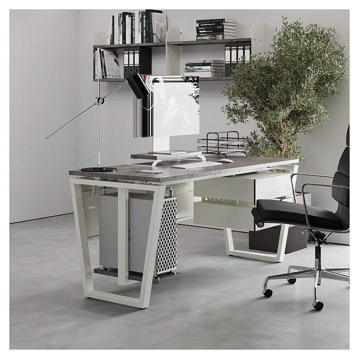 Компьютерный стол Кобор КOTR-160/70 white/chicago используется в офисных помещениях и кабинетах руководителей. Модель оснащена опорами в форме обратной трапеции. Каркас выполнен из металла, выкрашенного в цвет белый муар (RAL9016), столешница – из ламинированной древесно-стружечной плиты (ЛДСП) цвета бетон чикаго (F186 ST9). Опции (заказываются отдельно):