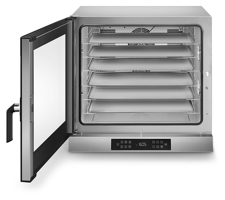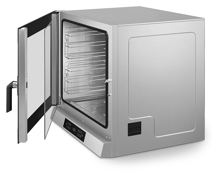 Конвекционная печь Smeg ALFA 625 E1HDS предназначена для выпечки хлебобулочных и кондитерских изделий и приготовления различных блюд на предприятиях пищевой промышленности, общественного питания и торговли. Принудительная вентиляция позволяет равномерно распределить тепло в камере. Корпус и камера выполнены из нержавеющей стали. В комплект поставки входит вытяжной зонт K4610X с угольным фильтром для очистки воздуха от пара, гари и жира. Модель оснащена сенсорным управлением с подсветкой белого цвета, пароконденсатором и лабиринтными фильтрами. Корпус выполнен из полированной нержавеющей стали. Рекомендуется дополнительно приобрести водоумягчитель и фильтр-систему для очистки и смягчения воды. Режимы приготовления: