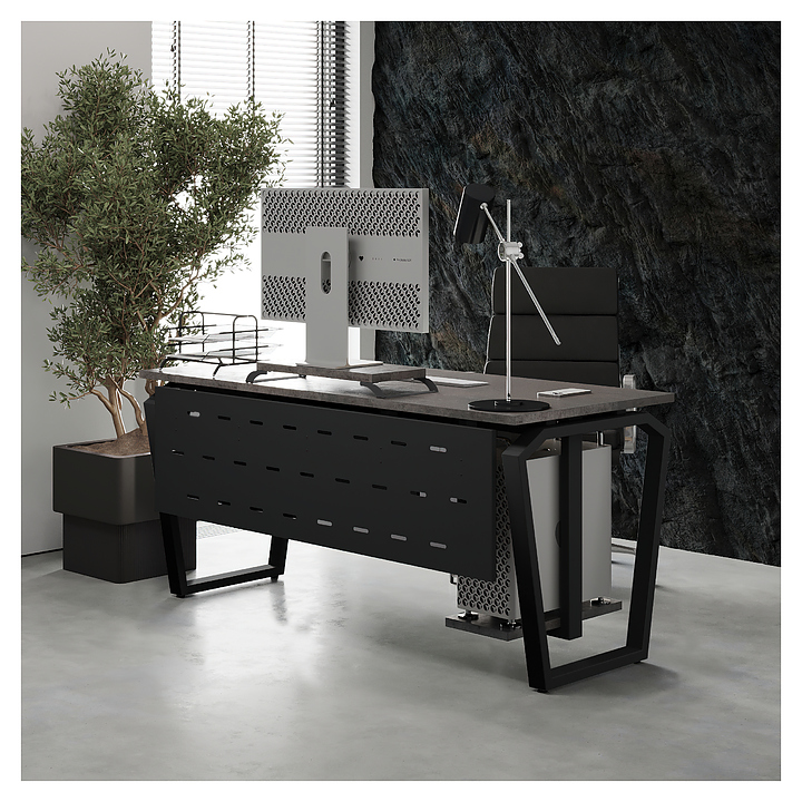 Компьютерный стол Кобор KTB-100/60 black/chicago используется в офисных помещениях и кабинетах руководителей. Модель оснащена опорами в форме обратной трапеции со скошенными верхними углами. Каркас выполнен из металла, выкрашенного в цвет черный муар (RAL9005), столешница – из ламинированной древесно-стружечной плиты (ЛДСП) цвета бетон чикаго (F186 ST9). Опции (заказываются отдельно):