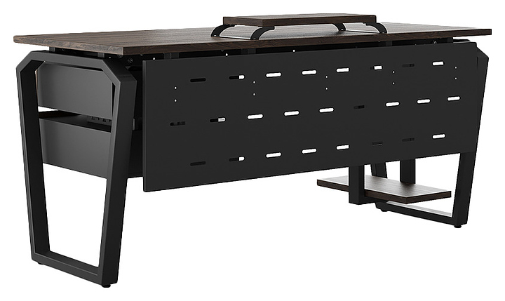 Компьютерный стол Кобор KTB-180/80 black/charlston используется в офисных помещениях и кабинетах руководителей. Модель оснащена опорами в форме обратной трапеции со скошенными верхними углами. Каркас выполнен из металла, выкрашенного в цвет черный муар (RAL9005), столешница – из ламинированной древесно-стружечной плиты (ЛДСП) цвета дуб чарльстон (H3154 ST36). Опции (заказываются отдельно):