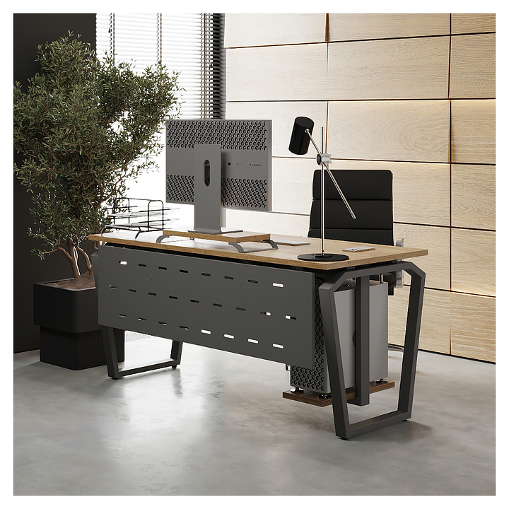 Компьютерный стол Кобор КTB-180/80 aluminum/natural используется в офисных помещениях и кабинетах руководителей. Модель оснащена опорами в форме обратной трапеции со скошенными верхними углами. Каркас выполнен из металла, выкрашенного в цвет алюминиевый металлик (RAL9006), столешница – из ламинированной древесно-стружечной плиты (ЛДСП) цвета натуральный дуб (H1180 ST37). Опции (заказываются отдельно):