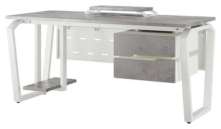 Компьютерный стол Кобор KTB-80/80 white/chicago используется в офисных помещениях и кабинетах руководителей. Модель оснащена опорами в форме обратной трапеции со скошенными верхними углами. Каркас выполнен из металла, выкрашенного в цвет белый муар (RAL9016), столешница – из ламинированной древесно-стружечной плиты (ЛДСП) цвета бетон чикаго (F186 ST9). Опции (заказываются отдельно):