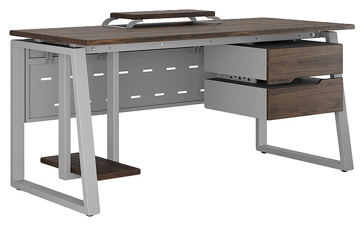 Компьютерный стол Кобор KTS1-140/60 aluminum/charlston используется в офисных помещениях и кабинетах руководителей. Модель оснащена опорами в форме наклонной трапеции. Каркас выполнен из металла, выкрашенного в цвет алюминиевый металлик (RAL9006), столешница – из ламинированной древесно-стружечной плиты (ЛДСП) цвета дуб чарльстон (H3154 ST36). Опции (заказываются отдельно):