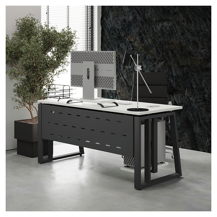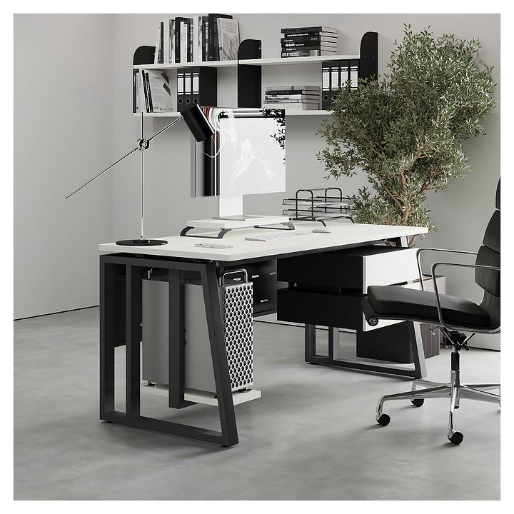 Компьютерный стол Кобор КTS2-80/80 black/premium используется в офисных помещениях и кабинетах руководителей. Модель оснащена усиленными вертикальными балками опорами в форме наклонной трапеции. Каркас выполнен из металла, выкрашенного в цвет черный муар (RAL9005), столешница – из ламинированной древесно-стружечной плиты (ЛДСП) цвета белый премиум (W1000 S9).