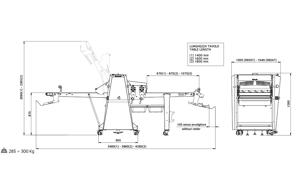 Напольная полуавтоматическая тестораскаточная машина Rollmatic R65S-T/14 используется в пекарнях, кондитерских, на других предприятиях пищевой промышленности, общественного питания и торговли для механизации раскатки теста с получением равномерно раскатанного пласта необходимой толщины, производства слоеного теста, а также возможности нарезки полученного пласта на заготовки для различных изделий. Модель оснащена 2 съемными с ленточным конвейером: со складным крылом и с секцией нарезки, раскаточными валками, 2 защитными решетчатыми крышками, станцией нарезки и электромеханическим управлением. Корпус выполнен из стали с антикоррозийным покрытием, ящик для муки и крышки валков – из нержавеющей стали. Ножи для станции нарезки и боковые лотки не входят в комплект поставки и приобретаются отдельно. Особенности: