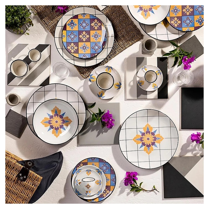 Чайная пара Oxford COUP Shape GRID 101239 ED02-4684 используется на предприятиях общественного питания и торговли, а также в домашних условиях для подачи чая. Коллекция отличается декором с используемыми в облицовочной плитке орнаментами в яркой контрастной комбинации белого, желтого, сиреневого и лилового тонов с черными сеткой и кантами на кромках. Модель состоит из круглого блюдца и чашки с плавно расширенным бортом и дугообразной рукояткой. Изделия выполнены из высококачественного фарфора с глянцевой глазурованной поверхностью. Цена указана за 1 шт. Особенности: