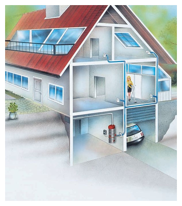 — усовершенствованный вариант бытового пылесоса, созданный для более качественной и полной уборки любого помещения: квартиры, офиса, загородного дома. Встроенный пылесос устанавливается за пределами жилой зоны (гараж, подвал, балкон, лоджия, подсобные помещения), и находится в статичном положении всё время функционирования. Вы производите уборку помещения, держа в руках шланг, подключенный в пневморозетку, Вам не надо таскать за собой аппарат, поэтому такая работа посильна даже ребенку или пожилому человеку. Главное достоинство встроенной системы уборки — отсутствие рециркуляции загрязненного воздуха. Чистота уборки помещений сохраняется на предельно высоком уровне в течение всего срока службы, а не падает по мере загрязнения фильтра. Безопасность: