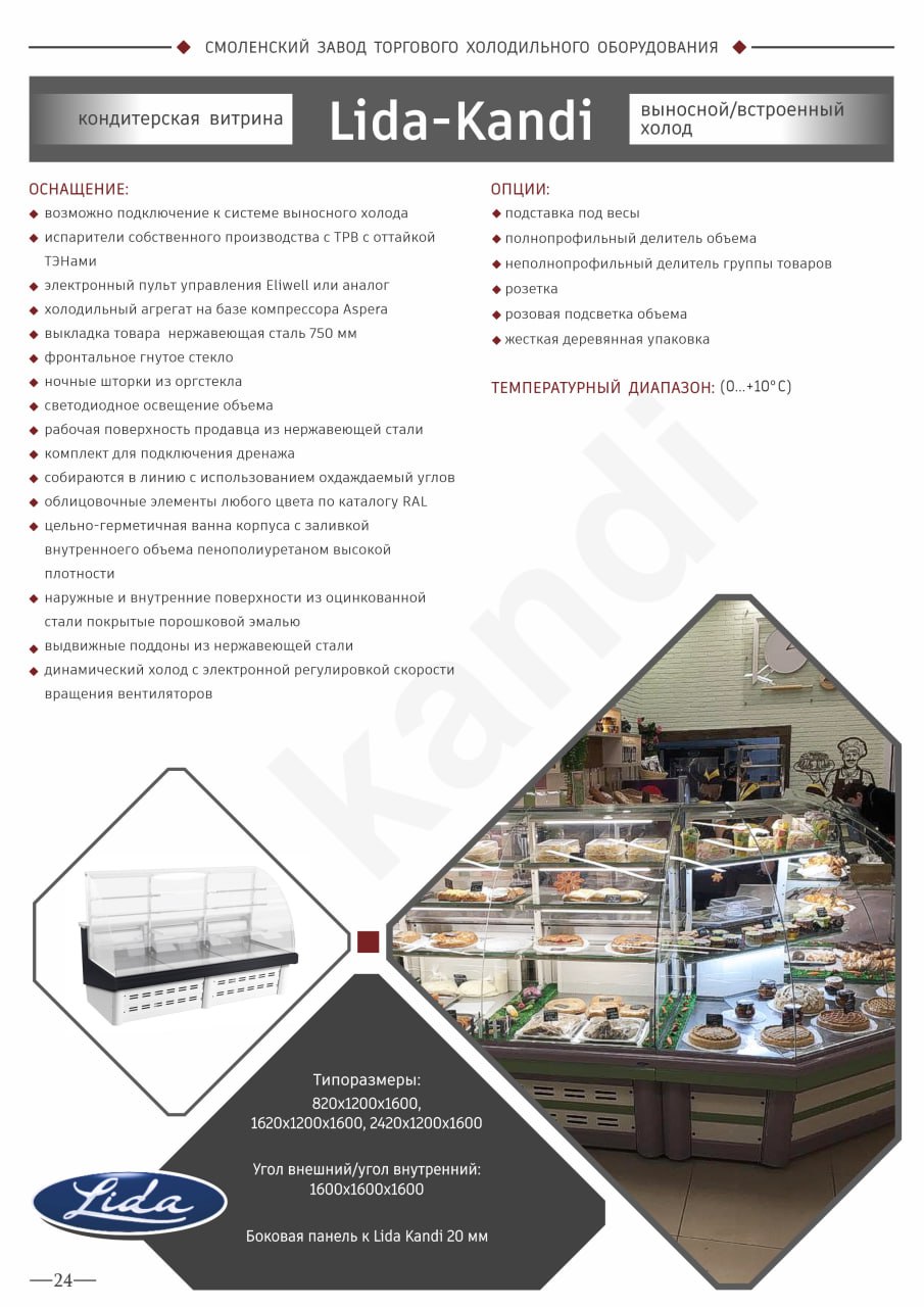 Бренд Lida принадлежит российской компании «Иней», которая занимается производством профессионального холодильного и торгового оборудования для предприятий общественного питания и торговли. Продукция Lida – это высокотехнологичное оборудование, изготавливающееся на собственном производстве в соответствии с действующими стандартами качества. ENTERO - официальный партнёр