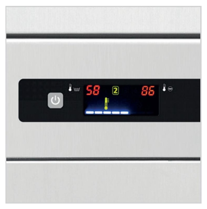 • Сенсорная панель управления отображает температуру как в баке, так и в бойлере, цикл и статус мойки, а также возможные основные коды аварийных сигналов при неисправностях