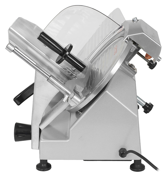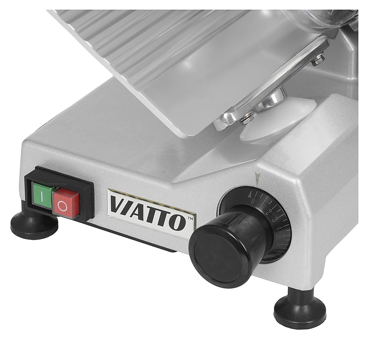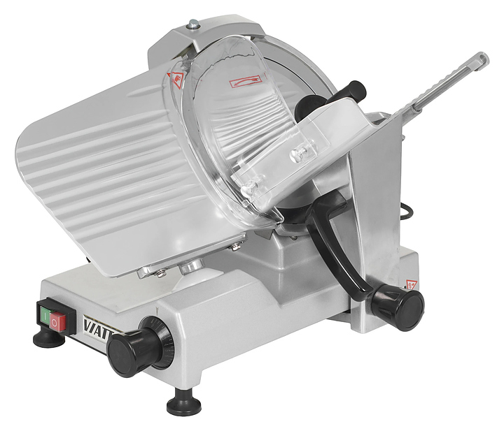 Полуавтоматический слайсер VIATTO VA-250 используется на предприятиях общественного питания и торговли для нарезки мяса, сыра, колбасных изделий и других пищевых продуктов на ровные и равные ломтики. Модель оснащена съемным затачивающим устройством, механизмом регулировки толщины нарезки и устойчивыми нескользящими опорами. Корпус выполнен из алюминия. Дополнительные характеристики: