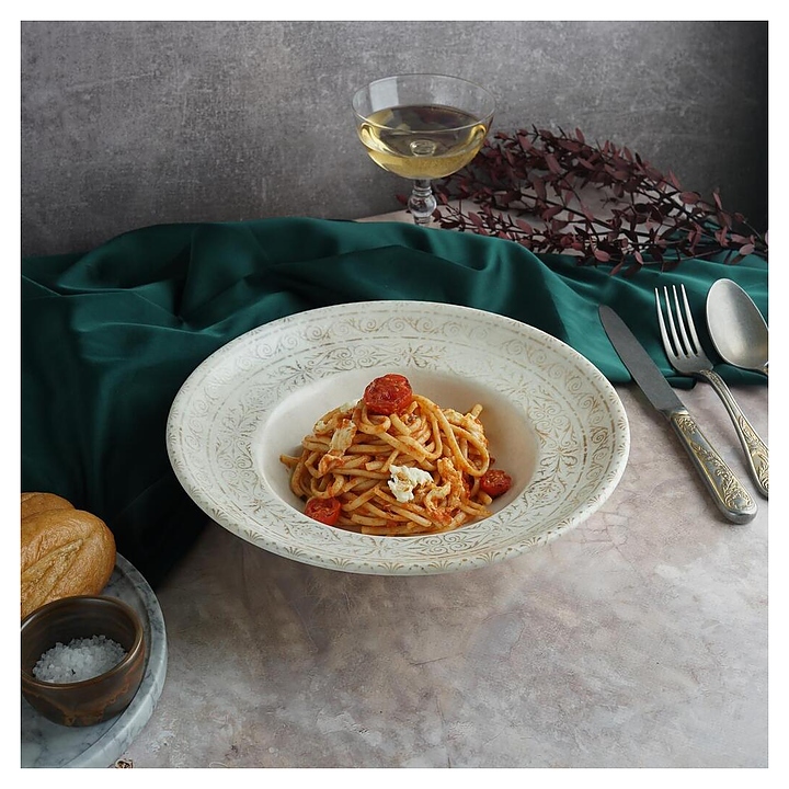 Глубокая тарелка By Bone Antico AN-ZT-27-CK используется в ресторанах, кафе, на других предприятиях общественного питания и в домашних условиях для подачи первых блюд и пасты. Модель круглой формы оснащена плавно расширенным в основании бортом с широкими полями. Изделие выполнено из высококачественного белого фарфора с эффектом состаренной поверхности и изящными орнаментами в коричневых тонах. Цена указана за 1 шт. Особенности: