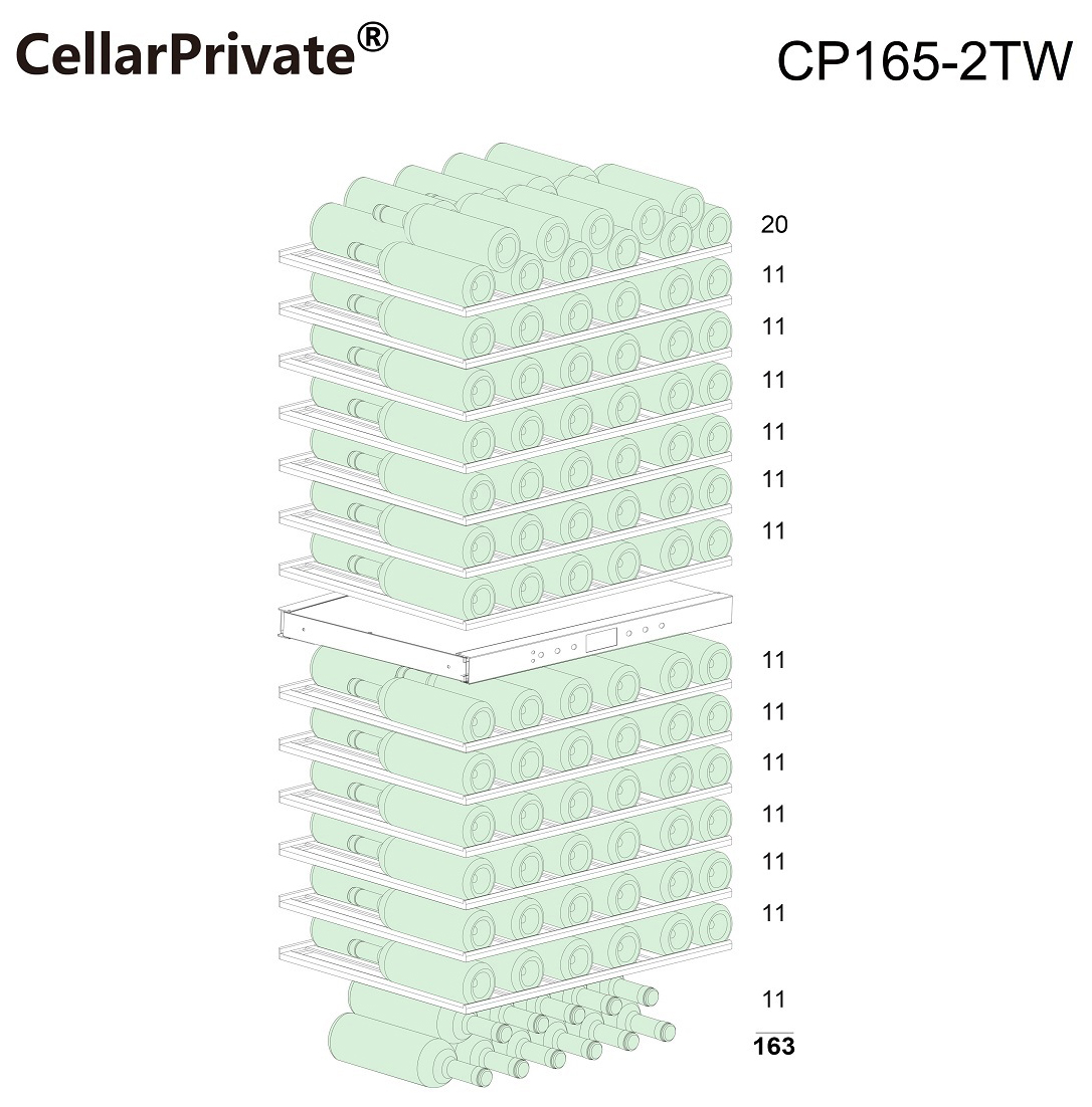 Винный шкаф Cellar Private CP165-2TW предназначен для хранения бутилированного вина различных сортов в барах, ресторанах, специализированных магазинах, подсобных складских помещениях, а также в домашних условиях. Модель оснащена сенсорной панелью управления, которая находится внутри шкафа за дверцей, цифровым дисплеем для отображения температуры в камере и 13 съемными полками. Корпус выполнен из окрашенного металла, дверь - из металла, пластика и двойного стекла с защитой от УФ-излучения, полки - из дерева, ручка двери - из металла. Особенности: