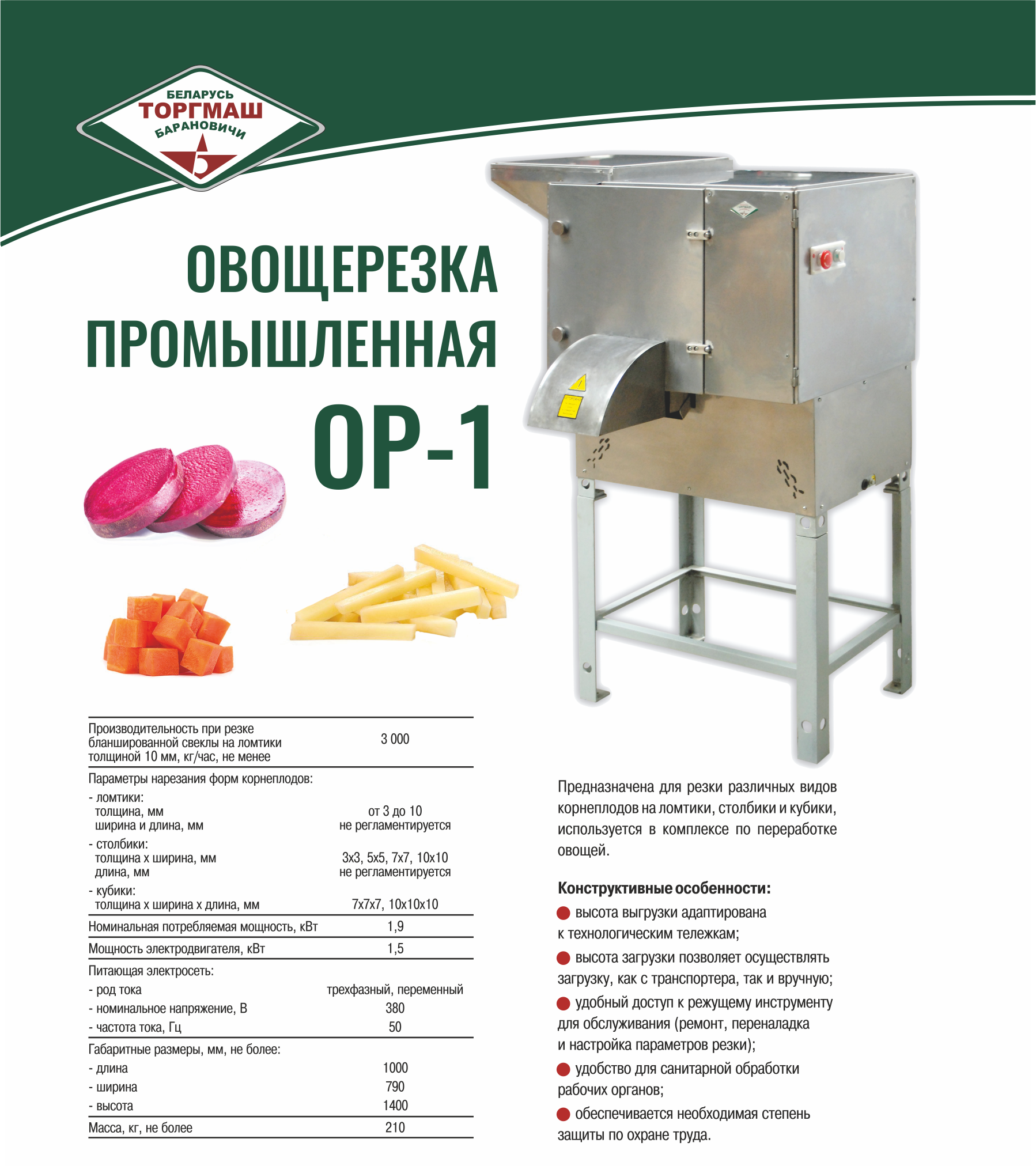 Промышленная овощерезка БЕЛТОРГМАШ ОР-1 используется на предприятиях общественного питания и торговли для резки бланшированных корнеплодов на ломтики, столбики и кубики. Особенности: