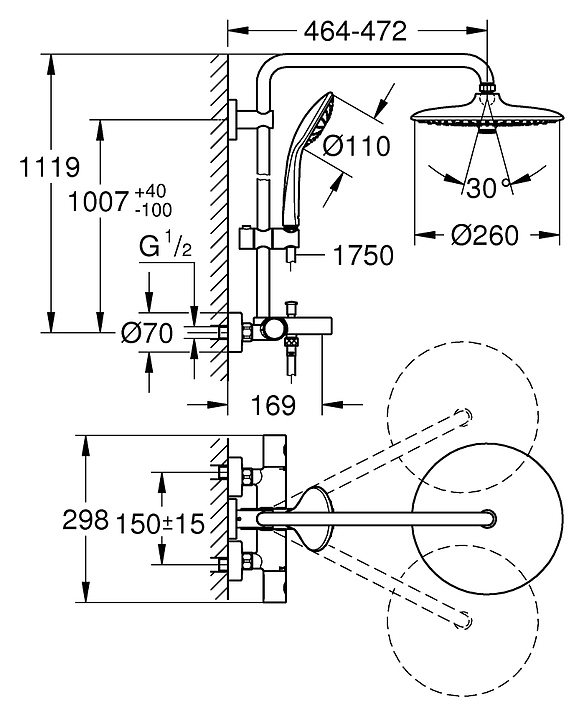 Душевая система с термостатом Grohe Euphoria System 260 26114002 предназначена для использования в ванных помещениях для подачи горячей и холодной воды. Модель оснащена поворотным верхним тропическим душем с изменяемым углом, душевой стойкой, однорежимным ручным душем с душевым шлангом, а также термостатическим картриджем, обеспечивающим поддержание необходимой температуры в независимости от давления воды. Корпус изделие выполнен из высококачественной латуни, отличающейся прочностью, долговечностью и устойчивостью к перепадам температур, верхний душ - из пластика. Комплектация: