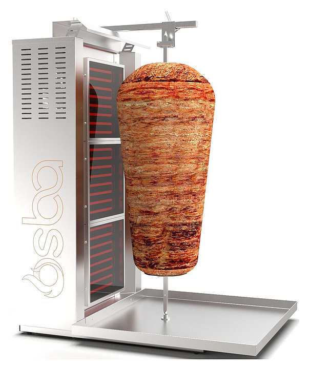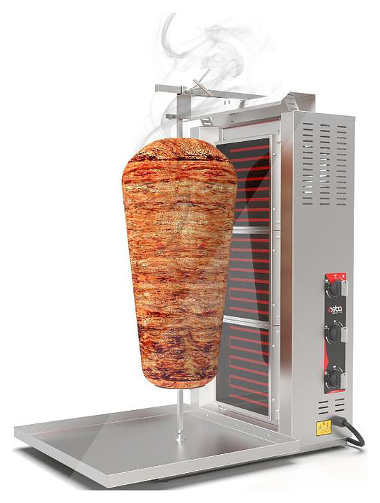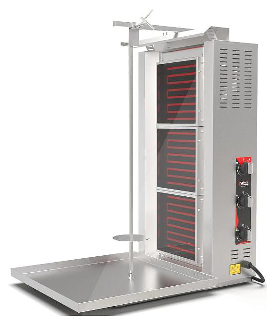 Электрический гриль Osba SH3-C предназначен для обжарки большого количества различных видов мяса и птицы при приготовлении начинки для шаурмы, донера и других блюд на предприятиях общественного питания и торговли. Размещение на вертикальном вертеле и ручное управление вращением обеспечивают равномерное приготовление. Модель оснащена защитным козырьком и 3 зонами нагрева, каждая из которых имеет индивидуальное управление с плавной регулировкой мощности. Покрытие на нагревательных элементах гарантирует легкую очистку. Перемещение вертела вперед и назад позволяет регулировать расстояние между мясом и нагревом при разном количестве заготовки. Корпус выполнен из пищевой нержавеющей стали, которая отличается прочностью и долговечностью, защита нагревателей - из жаростойкой стеклокерамики. Дополнительные характеристики: