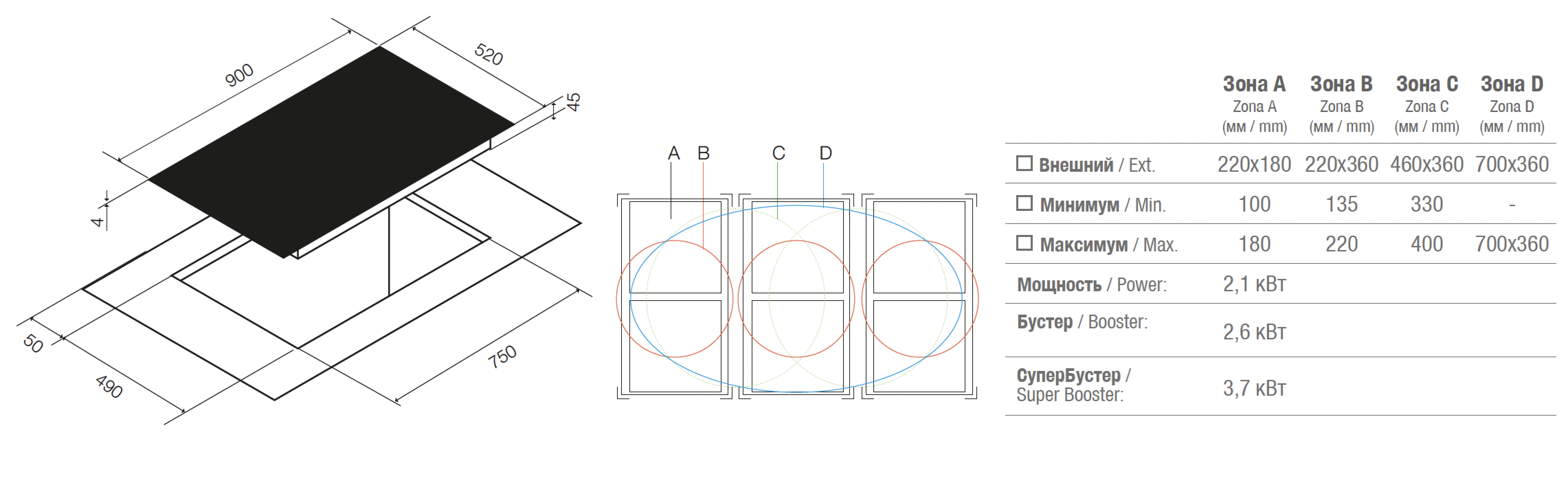 Максимальная мощность независимых варочных зон (в режиме Booster / SuperBooster): 2,1 (2,6 /3,7) кВт