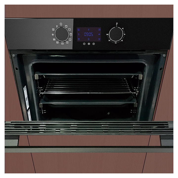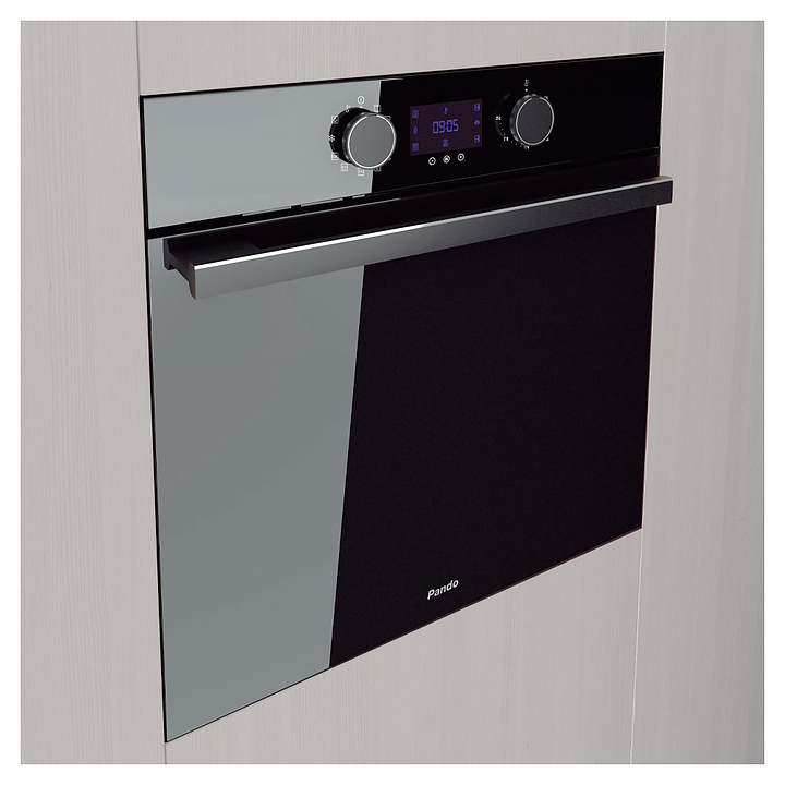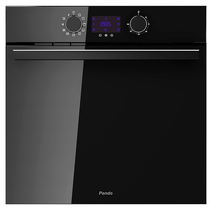 Встраиваемый электрический духовой шкаф Pando PHB-961предназначен для приготовления большого ассортимента блюд в домашних условиях. Модель оснащена камерой с расположенными в задней стенке вентилятором и кольцевым нагревательным элементом, верхним и нижним нагревательными элементами, верхним грилем, 2 боковыми стойками с 5 уровнями направляющих для противней, откидной дверью со смотровым окном и горизонтальной рукояткой, кабелем питания, панелью управления с 2 поворотными переключателями, фунциональными сенсорными клавишами и жидкокристаллическим дисплеем с голубой подсветкой индикации. Корпус выполнен из высококачественной стали, верхняя панель и дверь с полным фронтальным остеклением без винтового крепежа черным стеклом с глянцевой поверхностью, противни – из стали с покрытием эмалью легкой очистки, боковые стойки и решетка с хромированной поверхностью, рукоятка – из анодированного алюминия с матовой черной поверхностью и серебристой вставкой, переключатели с мягким покрытием Soft Touch черного цвета.
