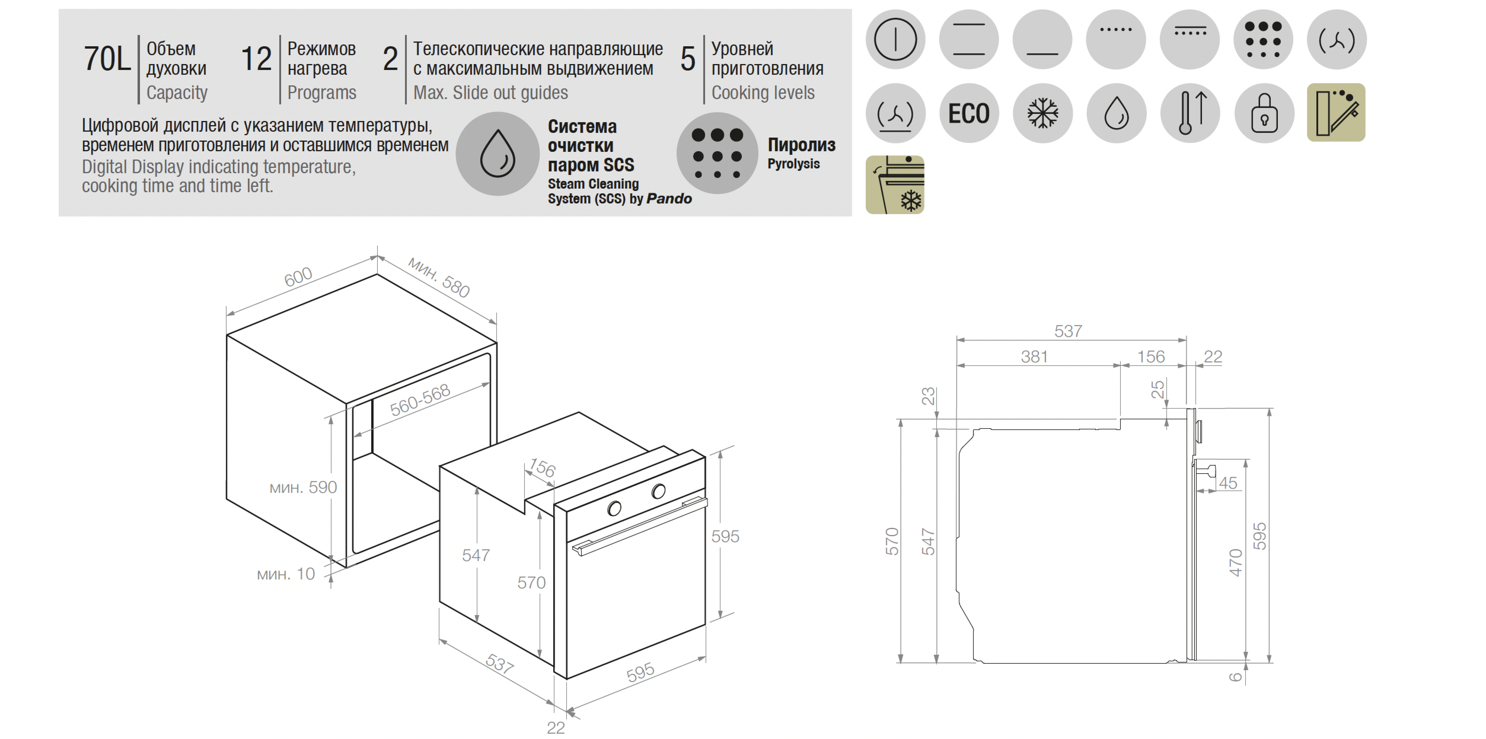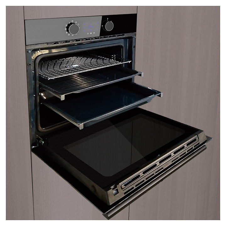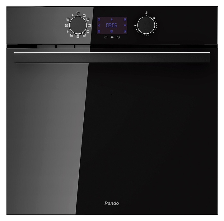 Встраиваемый электрический духовой шкаф Pando PHP-962предназначен для приготовления большого ассортимента блюд в домашних условиях. Модель оснащена камерой с расположенными в задней стенке вентилятором и кольцевым нагревательным элементом, верхним и нижним нагревательными элементами, верхним грилем, 2 боковыми стойками с 5 уровнями направляющих для противней, откидной дверью со смотровым окном и горизонтальной рукояткой, кабелем питания, панелью управления с 2 поворотными переключателями, фунциональными сенсорными клавишами и жидкокристаллическим дисплеем с голубой подсветкой индикации. Корпус выполнен из высококачественной стали, верхняя панель и дверь с полным фронтальным остеклением без винтового крепежа черным стеклом с глянцевой поверхностью, противни – из стали с покрытием эмалью легкой очистки, боковые стойки и решетка с хромированной поверхностью, рукоятка – из анодированного алюминия с матовой черной поверхностью и серебристой вставкой, переключатели с мягким покрытием Soft Touch черного цвета.
