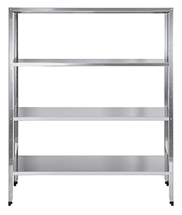 Кухонный стеллаж Braum СТ-13/4/180 предназначен для использования в производственных цехах предприятий общественного питания, супермаркетах, комбинатах пищевой промышленности для хранения столовой посуды, а также продуктов в подсобных помещениях. Модель оснащена 4 полками с П-образными ребрами жесткости. Стойки в форме уголка, полки и усиление полок выполнены из нержавеющей стали AISI 430. Дополнительные характеристики: